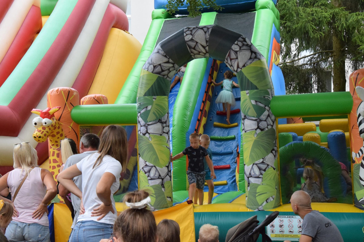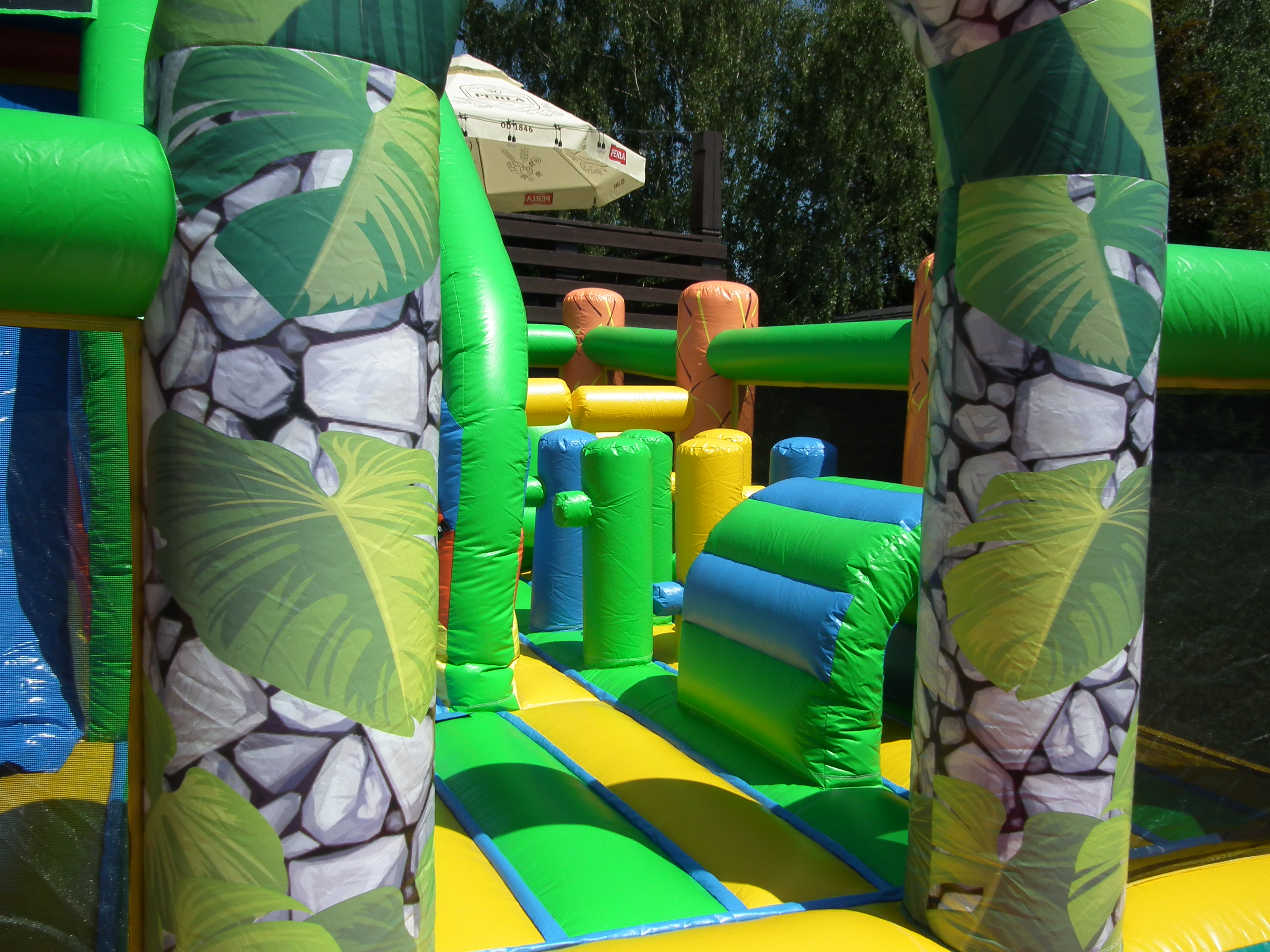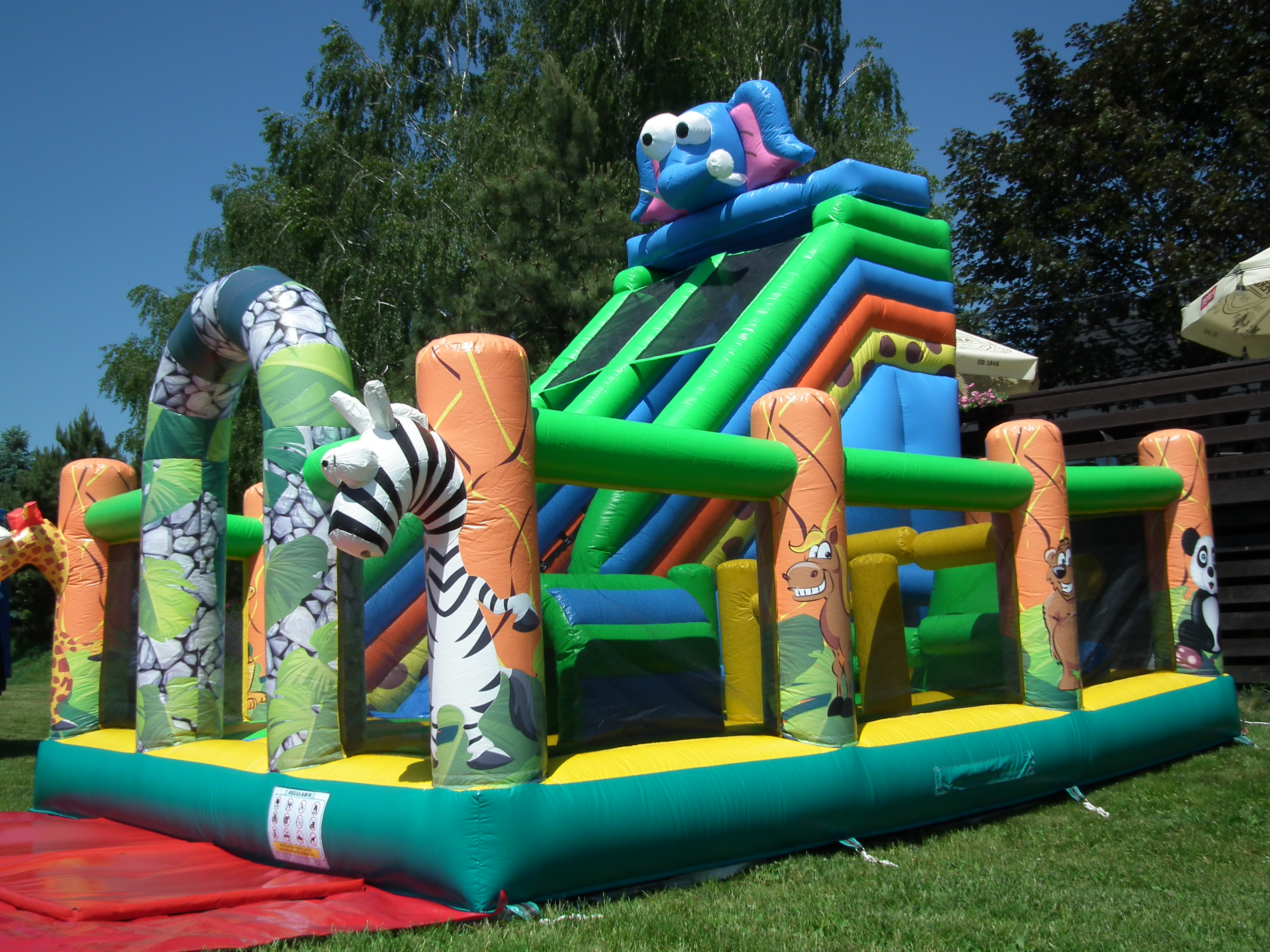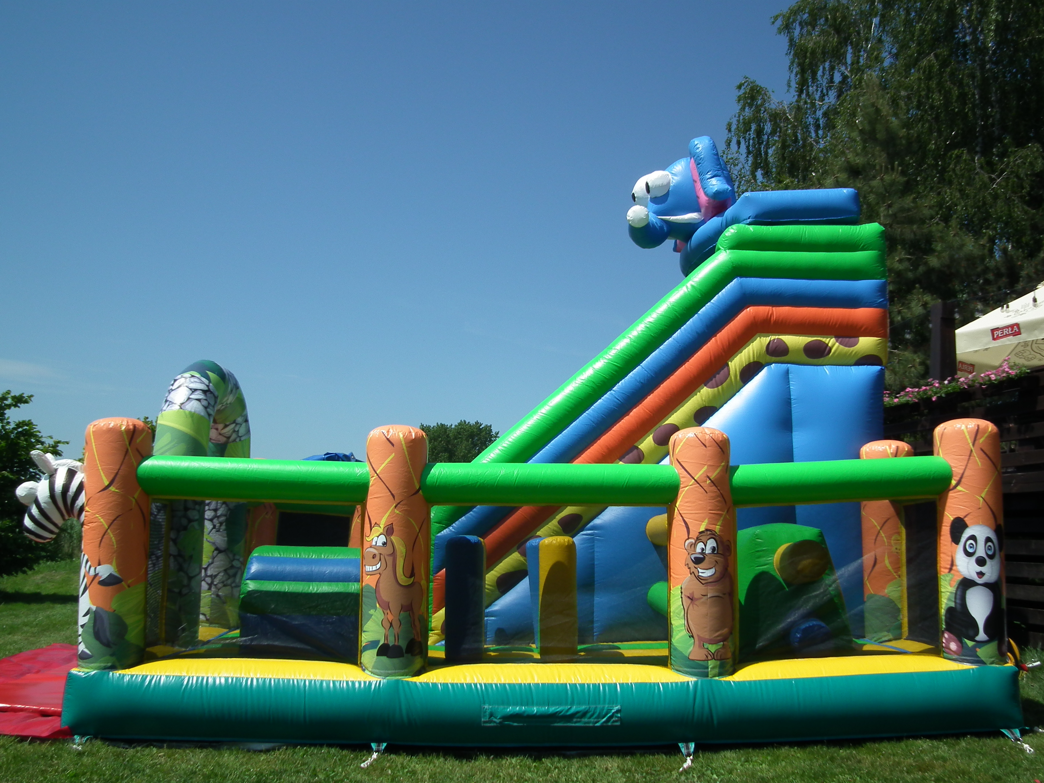 Nasza kolejna zjeżdżalnia typu ŚREDNIA z tematką SAFARI jest połączeniem zjeżdżalni z placem zabaw i torem przeszkód tworzy fantastyczny dmuchaniec dla dzieci.