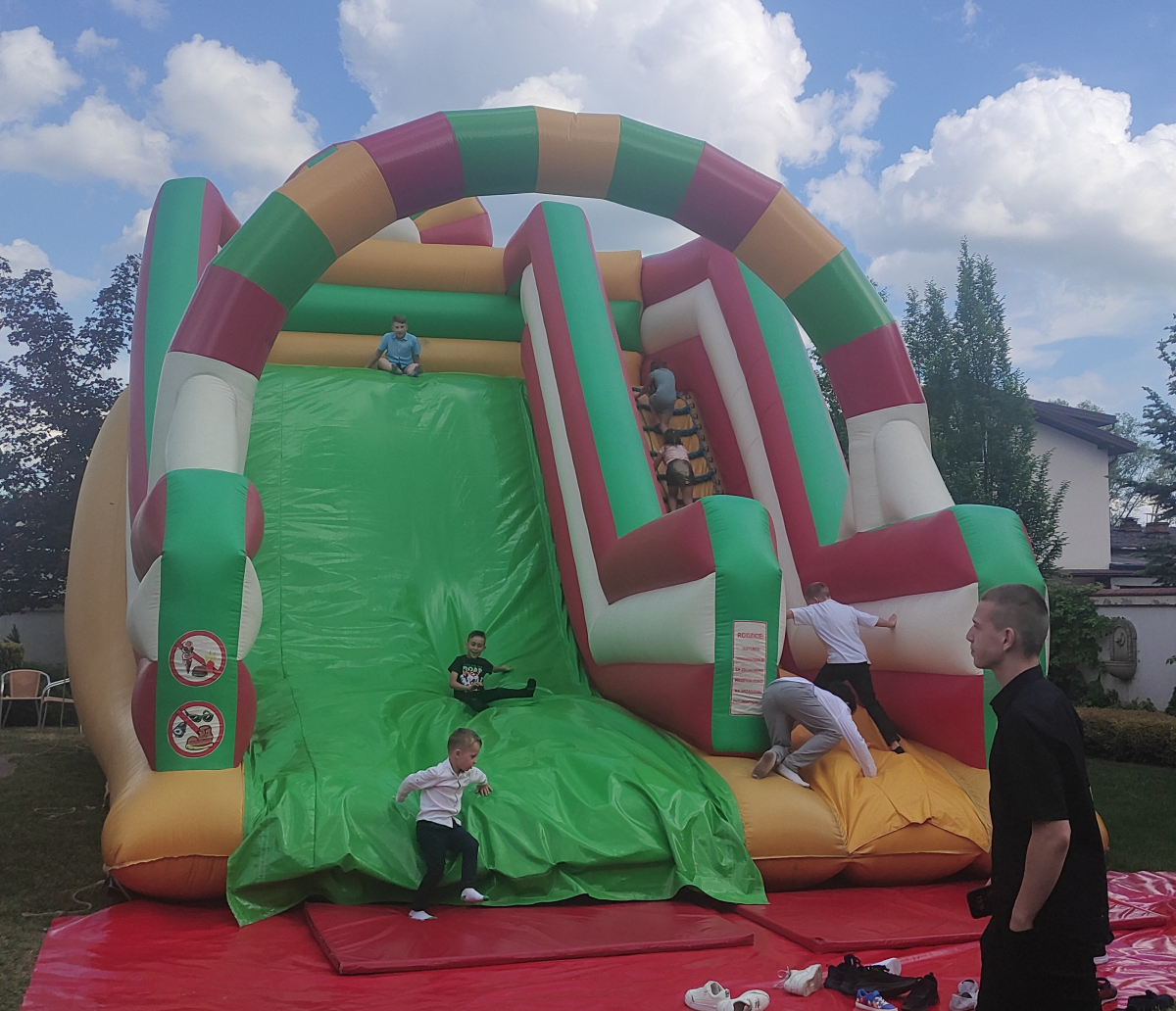 Zjeżdżalnia posiada mega szeroki ślizg z którego może korzystać SWOBODNIE I BEZPIECZNIE nawet 5-6 dzieci jednocześnie, dzięki temu ma bardzo dużą przepustowość.