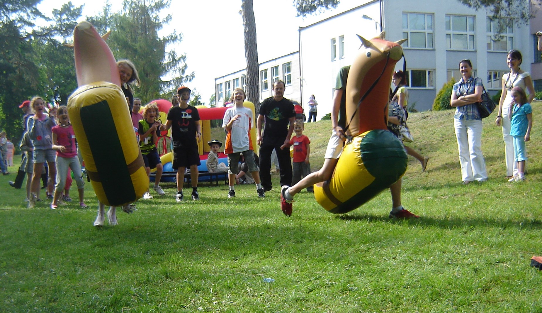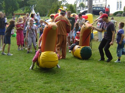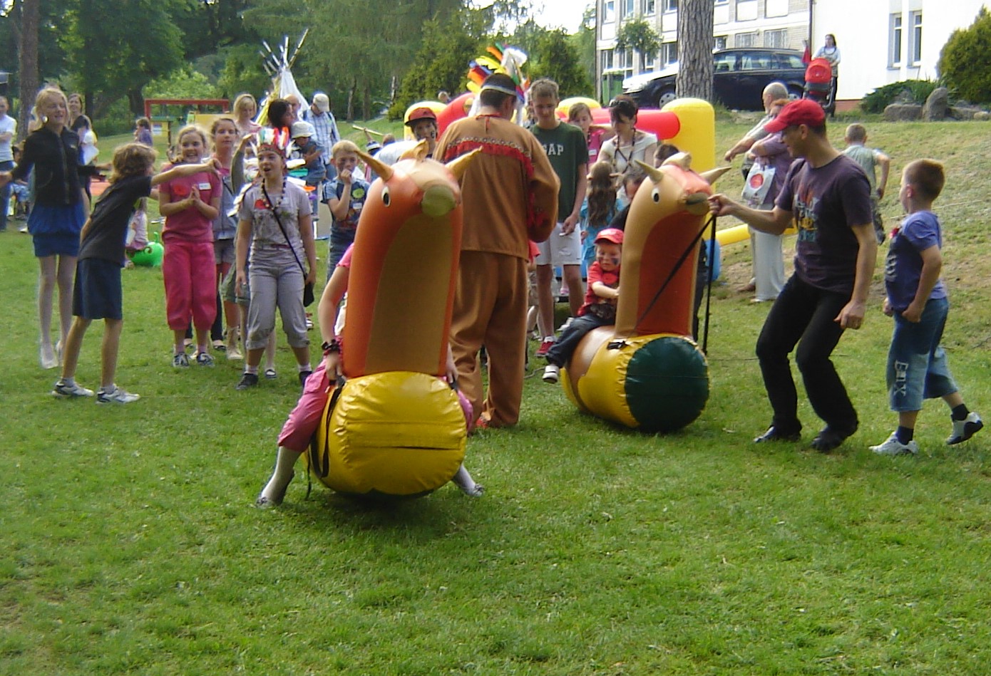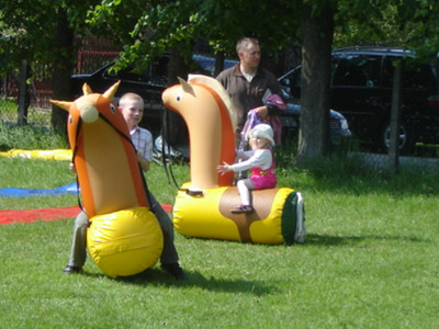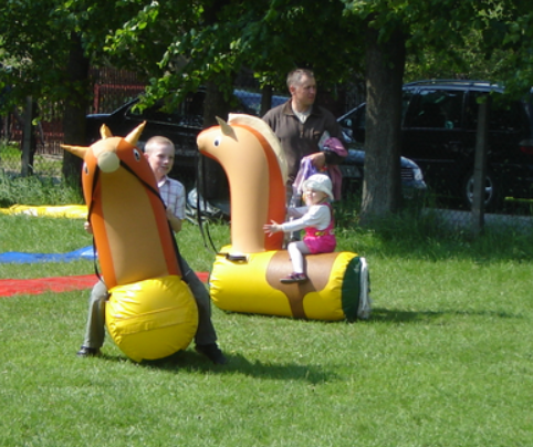 W naszej ofercie posiadamy dmuchane koniki, zabawa polega na tym, iż uczestnicy zabawy dosiadają swoje rumaki i wykonują skoczne ruchy podobne jak w skakaniu żabką i sprawią, że „dmuchane koniki zamieniają się w prawdziwe wyścigowe konie i zaczynają biegać”.