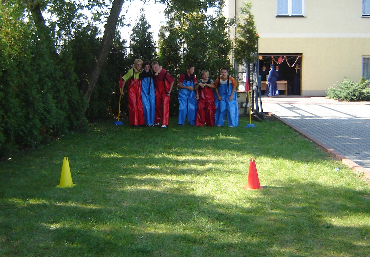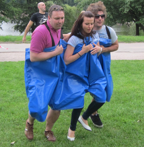 Zawodnicy ubrani w potrójne spodnie biegną do mety na czas, jednak nie jest to łatwe ma zawodnicy mają „splątane nogi”.