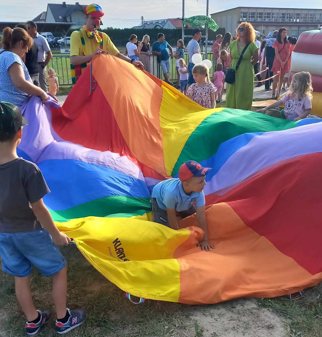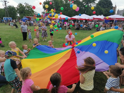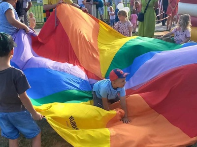 Bajecznie kolorowa, okrągła chusta animacyjna daje możliwość zabawienia większej grupy dzieci.