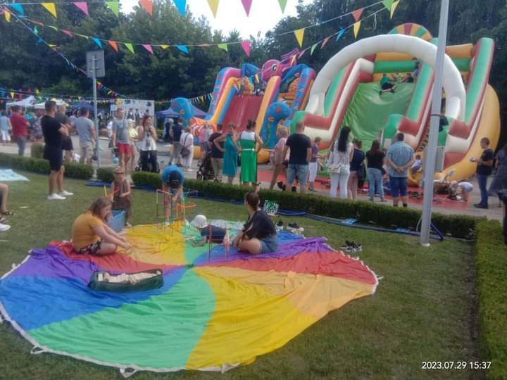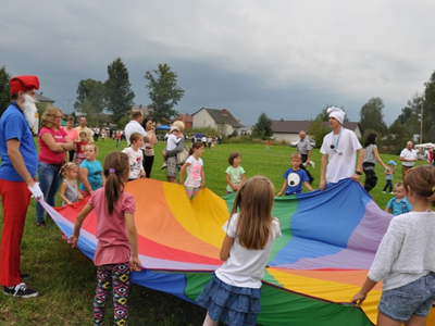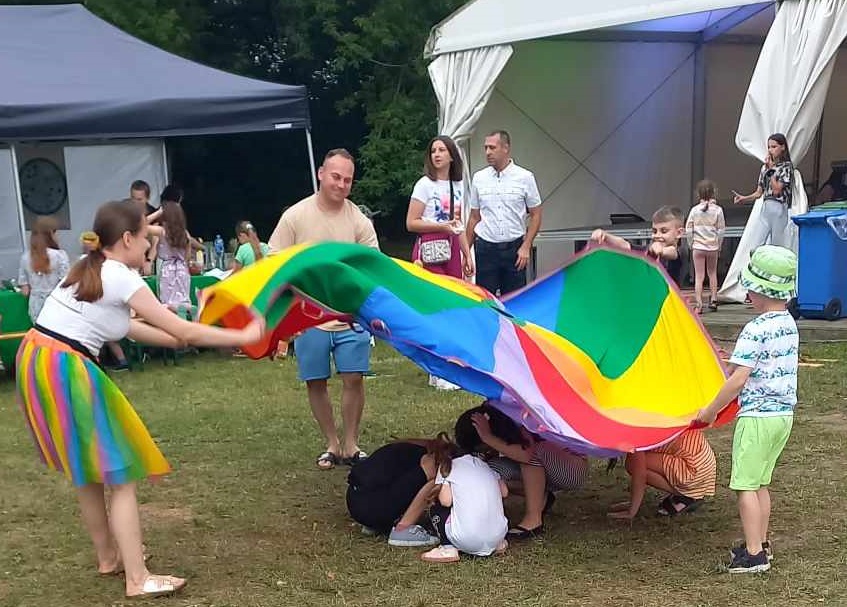 Dzieci mogą miło spędzić czas na różnych zabawach z chustą animacyjną np. zabawy Rybaków, w Morze (kołysanie chustą, tworzenie fal, pływanie w morzu), zabawa w spadochron oraz turlanie piłeczek i wiele wiele innych wciągających zabaw.