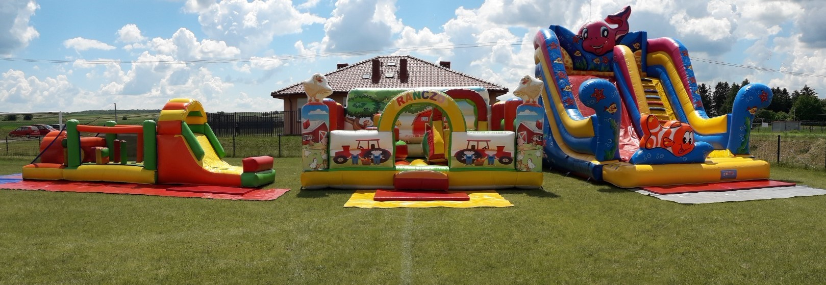 Posiadamy szeroką gamę urządzeń dmuchanych tzw. urządzeń rozrywkowych dla dzieci i dorosłych: zjeżdżalnie dmuchane, zamki dmuchane, dmuchane place zabaw, tor przeszkód, boisko piłkarskie i wiele innych dmuchańców różnego typu np. baseny z piłeczkami, mega dart rzutki, a także urządzenia mechaniczne np. trampolina euro bungee, siłomierz młot, kolejka szynowa czy karuzela.